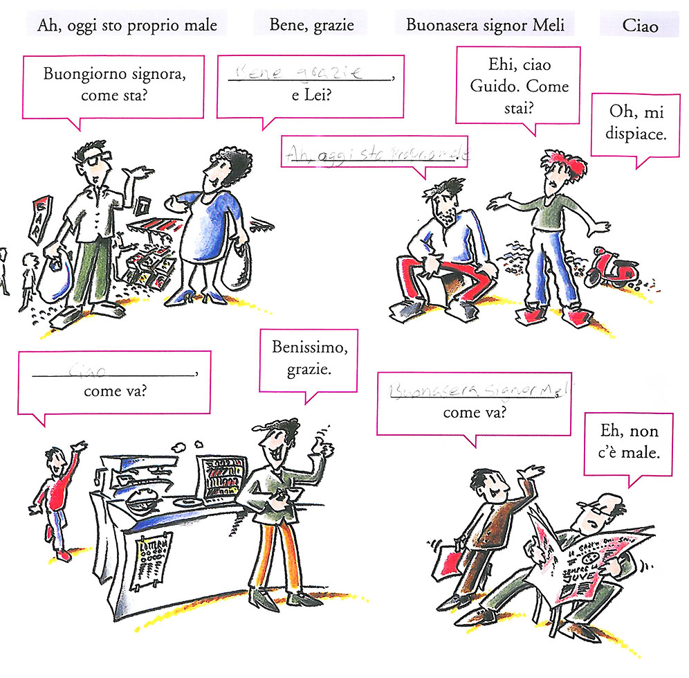 در سطرها خالی زیرمیبایست نحوه احوال پرسی به صورت محترمانه و دوستانه را بنویسید. سطر بالا در حالت محترمانه از come sta و در سطر دوم حالت دوستانه از come stai استفاده میشود. نکته اینکه come va حالت عمومی دارد و در هر دو حالت میتوان از آن استفاده کرد.